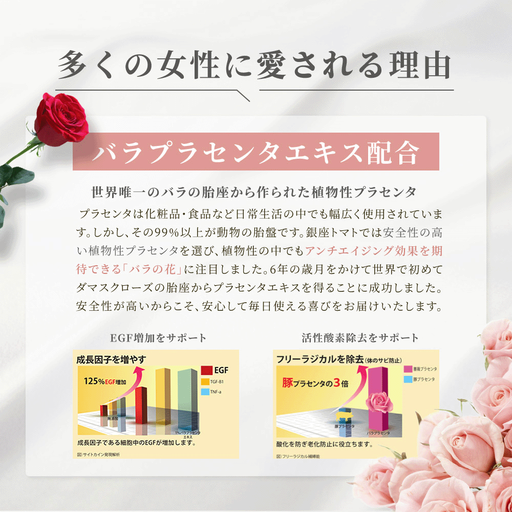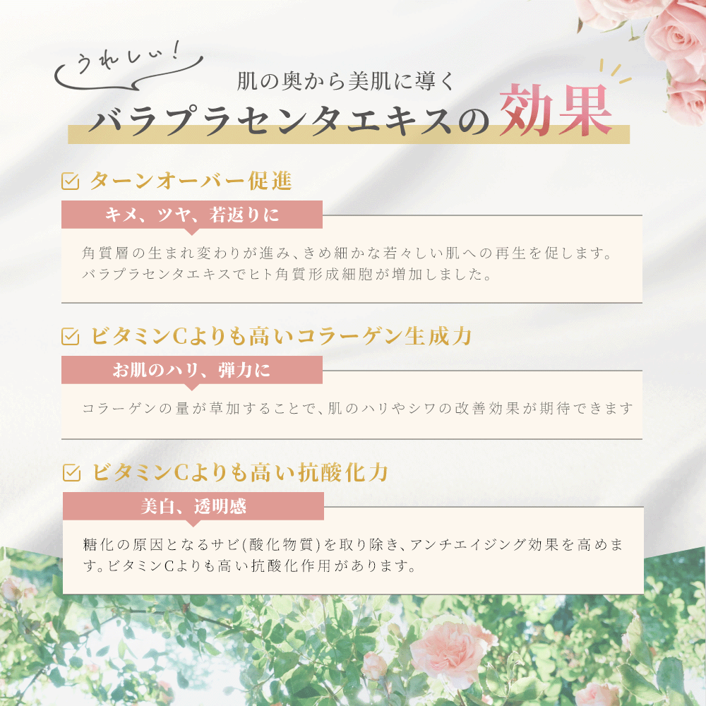 ※ダマスクバラ花水、ダマスクバラ花油、ホホバ種子油、ローズマリー葉エキス、オリーブ果実油、 ハイブリッドサフラワー油、セージ葉エキス、シア脂(保湿成分)